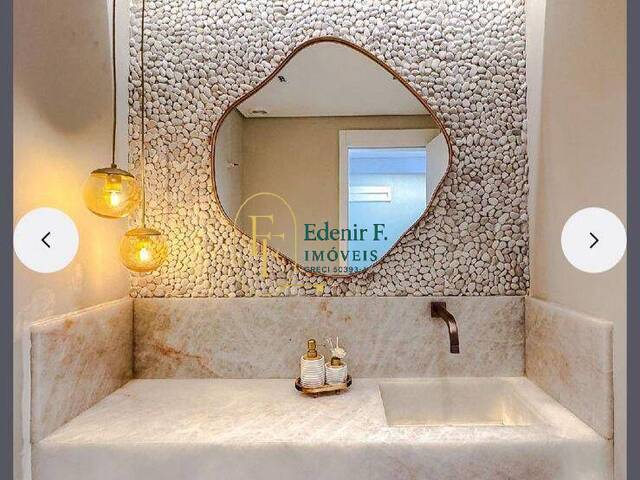 A área social impressiona pelo acabamento e funcionalidade. A cozinha é moderna e equipada com ilha em pedra slim branca e coifa, integrando-se perfeitamente aos ambientes. O lavabo se destaca pelo luxo, com pedra ônix e parede em seixo, criando um espaço sofisticado e exclusivo.